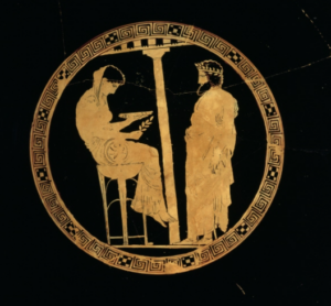 King Aegeus of Athens consulting the Delphic Pythia, Attic red-figure kylix (tondo), c. 440 BCE